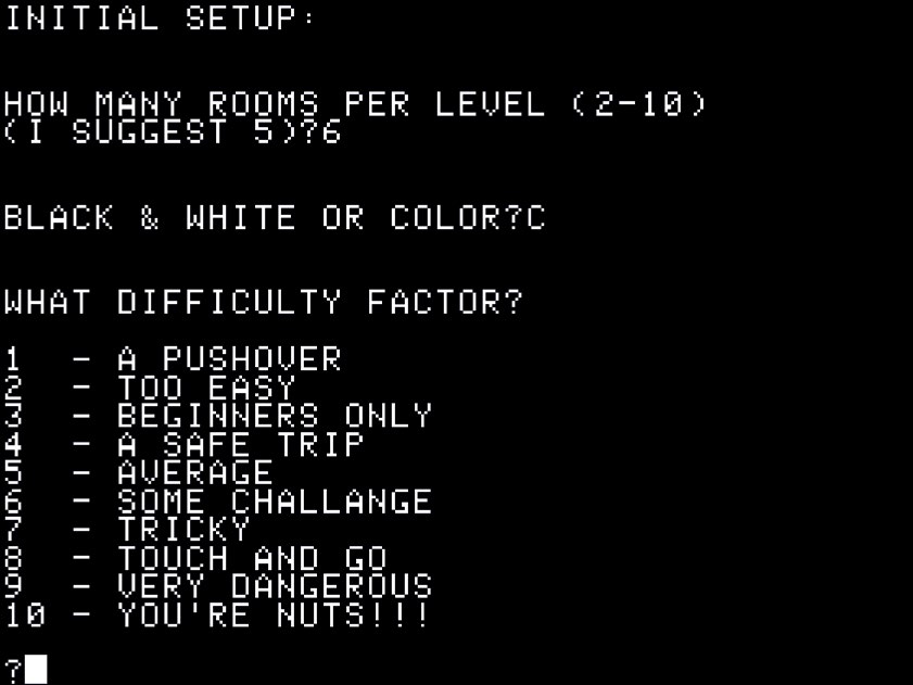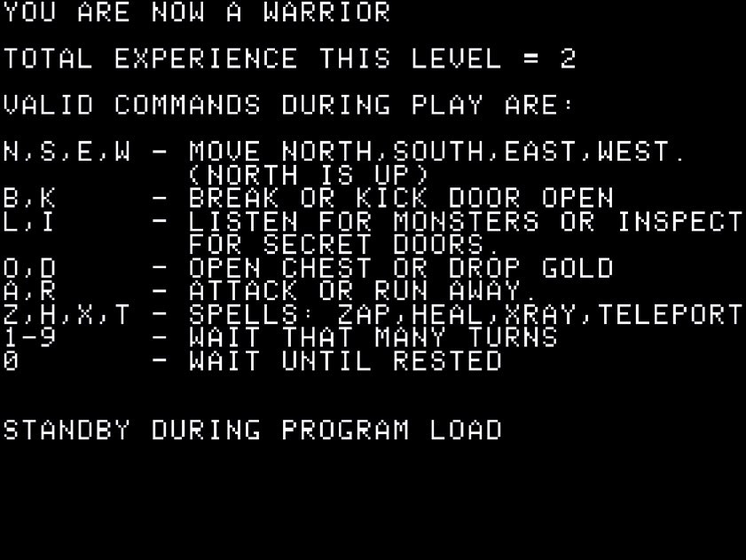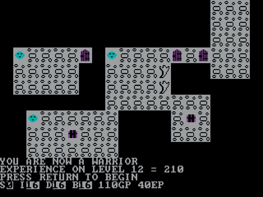 它的卡带版可以在仅仅 16K 大小的内存上运行,但如果是磁盘版(也就是我手上这种)就需要 32K 以上的内存。关卡是随着一边你探索地牢一边由系统生成的。怪物只有五种:绿色的史莱姆、鬼魂、山精、紫色的蠕虫还有红色的龙。随着你越深入地牢,它们也会变得越厉害。