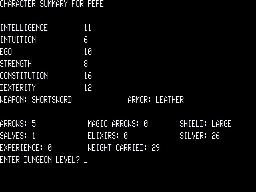 像是所有优秀的冒险故事一样,玩家在旅店开始游戏。旅店里可以给角色加点(或者让店长掷骰决定),也能购买装备。受《龙与地下城》启发,《阿帕莎神庙》的角色创建页面选用了一样的核心属性,可以自由地进行编辑。这样一来,既能方便玩家把桌面 RPG 中使用的角色继承过来,也能解决在原始的 TRS-80 卡带版本上不能存取角色信息的问题。