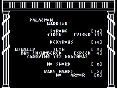 总的来说,《赫拉克勒斯的归来》之所以如此出众,原因要归功于游戏的高度娱乐性。这在它的出品年代尤为罕见。1983 年唯二能与之匹敌的只有《巫术》(Wizardry)和《创世纪》(Ultima)。但是《巫术》本来就不是同类型的作品,而在两年之后不列颠王(Lord British)[5]的另一款 CPRG才在叙事深度和共鸣方面有所精进,达到了斯图亚特·史密斯早已领悟的高度。当然,在引经据典方面,尤其是使用那些经过了千年沉淀的故事的时候,史密斯确实是讨了一点巧的。