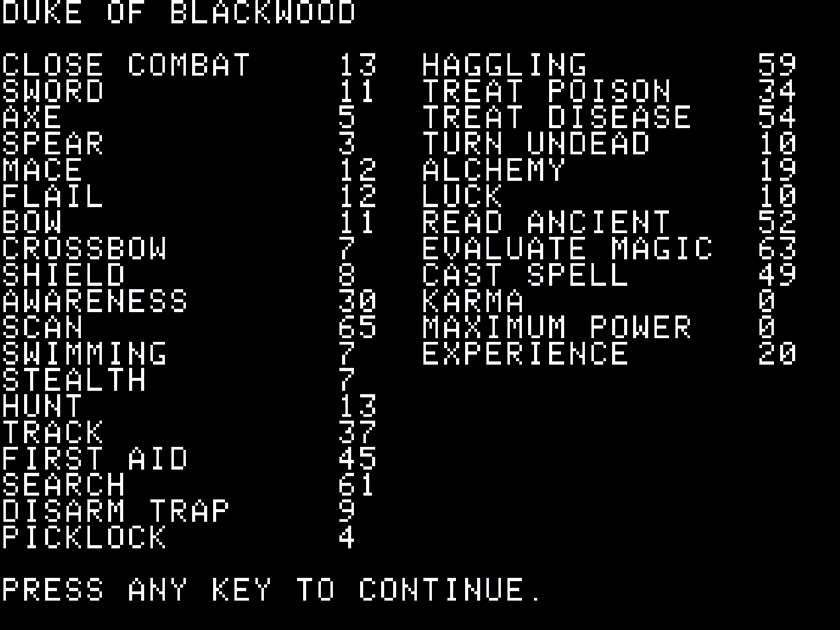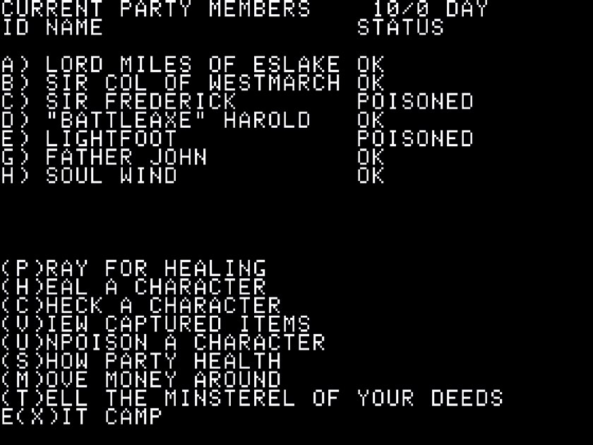 《巫师神冠》的续作是 1987 年的《永恒之匕》(The Eternal Dagger)[4],该作试图通过扩大游戏地图、丰富地图类型、增加解谜系统来改善前作的不足。但遗憾的是,由于引入疲劳值系统[5],本作对玩家的微观管理能力[6]提出更高要求,赶路时间也大幅增加[7]。所以,与前作相比,续作更考验玩家的耐心。与《巫师神冠》比起来,《永恒之匕》的机制复杂度是过犹不及,因此是一个退步。