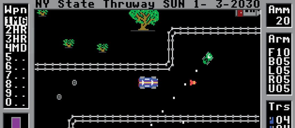 一直以来,反乌托邦的未来构想都是一种有趣的 RPG 游戏设定,到了 20 世纪 70 年代末,两部邪典电影[1]《死亡车神2000》与《疯狂的麦克斯》盛极一时,备受追捧,人们对反乌托邦题材的热情也水涨船高。斯蒂夫 · 杰克逊(Steve Jackson)巧妙地将这一设定融入一款 RPG 桌游——《飞车大战》(Car Wars)。这款游戏于 1980 年发售,畅销一时。在游戏中玩家打造私人专属的毁灭战车,在后末日时代的美国境内风驰电掣。后来,斯蒂夫 · 杰克逊与 Origin 公司达成协议,将《飞车大战》改编成电脑游戏,《飞车武士》就此问世。