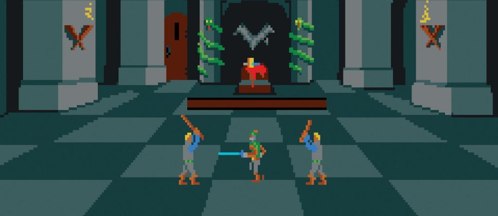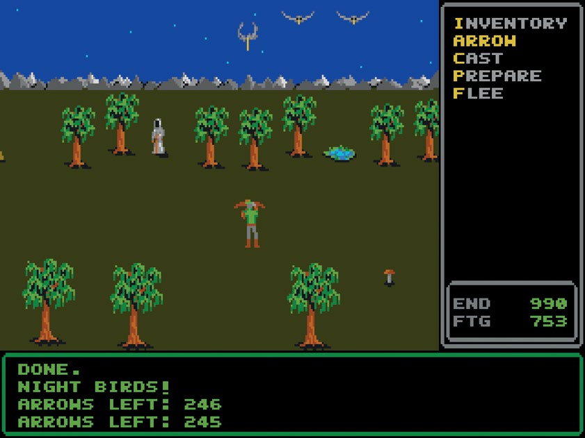大多数敌人都是在陆地上和你实时对战的;你可以用剑砍它们,施用法术,或者用弓箭对射。但也有一些敌人属于飞行生物,它们只能被弓箭或者制导法术击落——这很《太空侵略者》(Space Invaders)[2]。
