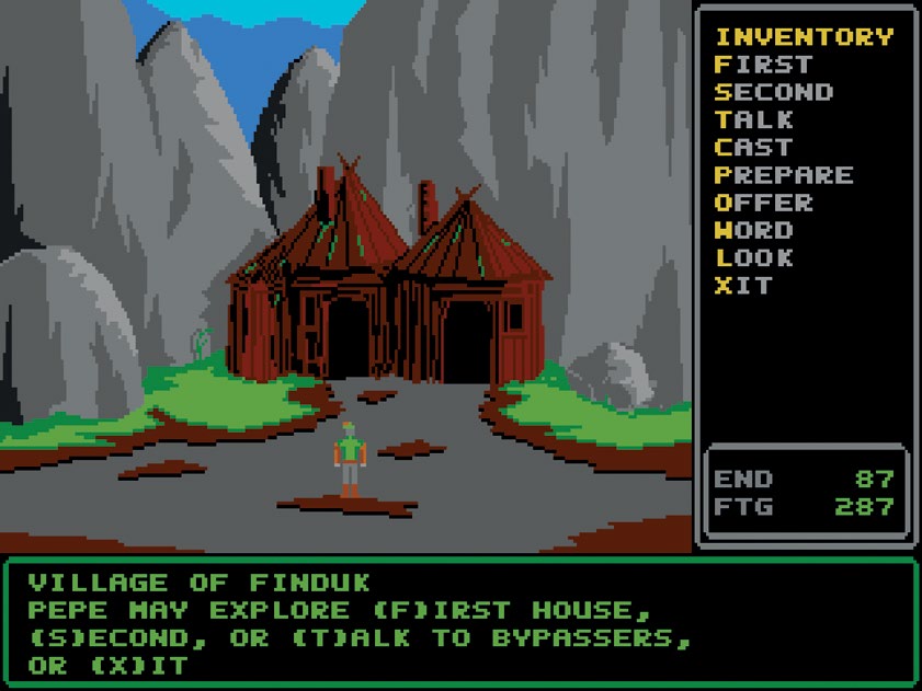 整个游戏世界被分割成一系列地点,比如村庄、森林、山川、地牢、和沙漠。你必须跑遍每一寸土地,收集物品,购买装备,和 NPC 攀谈以获取提示信息,以及偶尔打打怪。