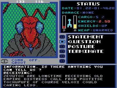 你的冒险始于一座星际公司(Interstel)的太空港口。你的角色去到太空港里的各个部门,为旅途作准备。你会看到游戏史上第一张“移动式菜单”。而你需要的是一队勇敢的船员,最多六名,可以从五个种族中进行招募[2]。其中既有学习速度很快的植物族,也有具备各项技能的机器人。机器人作为初始选择之一有利也有弊,虽然它们的各个技能数值在游戏早期来看非常突出,但是不像其它种族一样,能通过训练来进一步地提升。