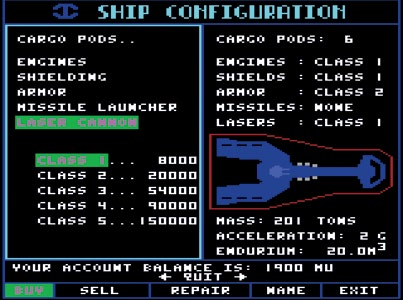 你有一笔初始资金,可以用来装备你的飞船,或者训练你的成员。但这笔钱数目很小,所以这会是一个两难的选择。到底是在船上置备一些武器和护盾呢,还是送你的科技官去接受训练,学会精确地扫描行星呢?游戏中没有手持物品的设定:如果你没有装备货仓就离开港口,就意味着已经和很多赚钱的机会说拜拜了。