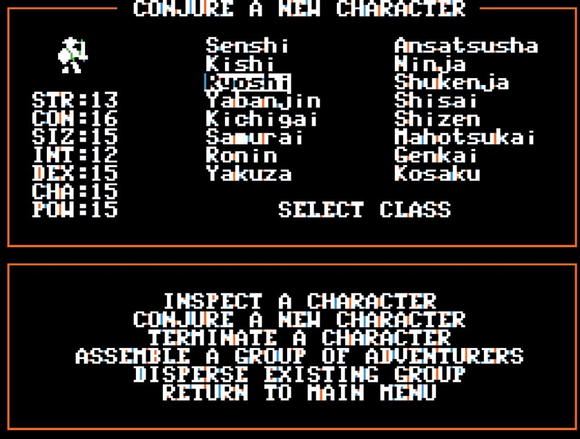 [1] 译者注:由于游戏的种族和职业是原创的日语,此处翻译参照 The CRPG Addict 和 WLau 的指南,前两者为种族,后两者为职业。精灵智商高、擅魔法、寿命长但物防低。半身人酷似精灵,但肤色较暗,体型更小,智商不及精灵但身手敏捷,能成为优秀的盗贼或刺客。术士受人尊敬,擅长用法术缴械或击杀敌人,而浪人在战斗中常用下三滥的技巧(如抠眼、踹裆),还可在守护灵的帮助下使用部分治愈术与防护术。