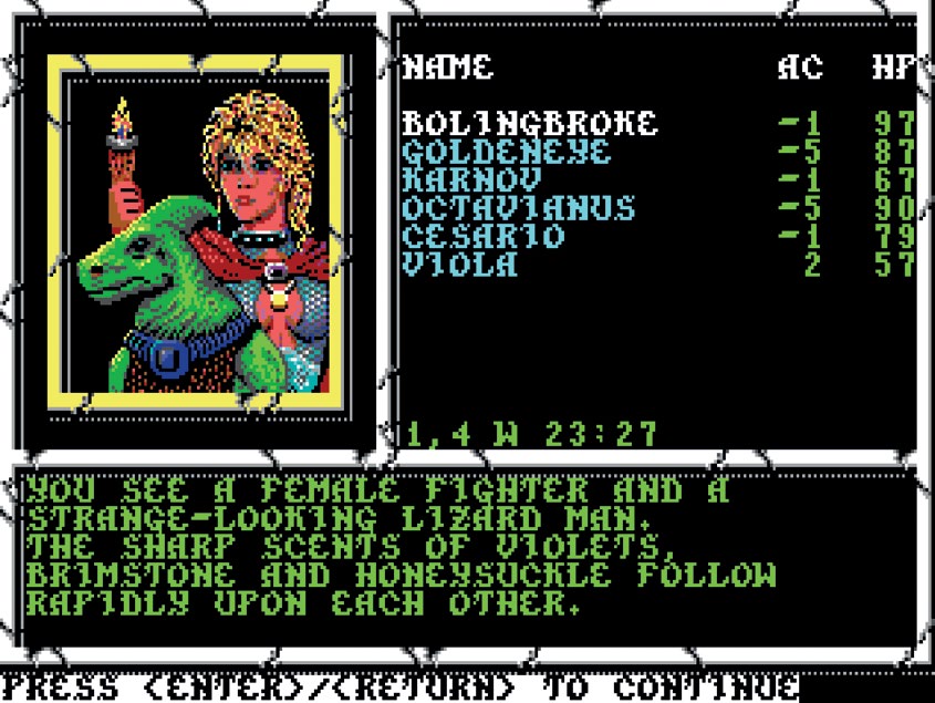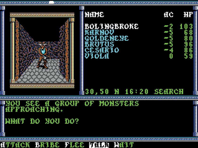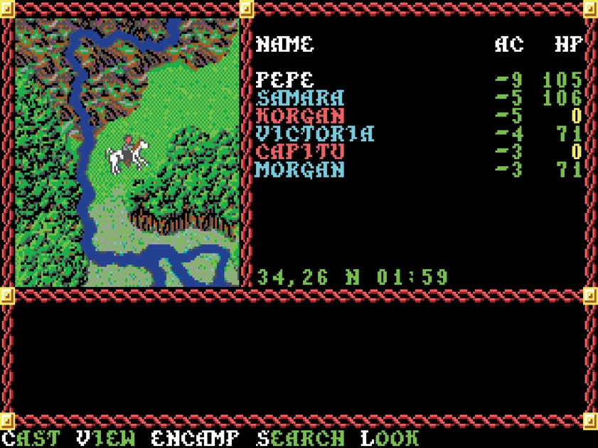探索过程是以第一人称视角呈现的,通过一个三维视角领略这一奇幻世界——类似《冰城传奇》(The Bard’s Tale)系列。界面有点过时而且反应缓慢,但每个角色的数据界面显示了玩家需要的所有重要信息。玩家必须要学会看血量、零级命中值[5]、护甲类型,会使用背包和咒语书,这样才能获得沉浸式的体验,还原用纸和笔游玩的感觉。