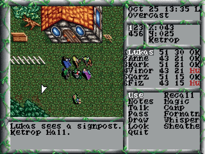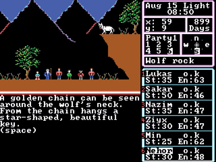 说到名字,你扮演的是卢卡斯(Lukas),一位年轻的游骑兵(Ranger)。你可以在大约 30 个 NPC 中雇佣最多五名同伴,一共有五个种族和九个职业,他们各有利弊。角色拥有和大多数传统 CRPG 类似的属性值和技能,但也有一些罕见的设计,比如狩猎和锻甲等技能,以及当时独一无二的宝石切割、裁缝、和木匠等。