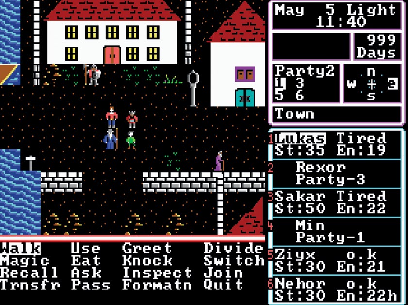 本作中一个很重要的方面就是要和 NPC 对话来找到阻止魔法之烛燃烧殆尽的线索。这个过程需要作很多很多笔记(或者截屏)。这里的 NPC 们也像《创世纪 5-7》一样有自己的作息时间,光是找到他们就已经是一件有难度的事情了。有些人甚至不会离开他们的房子,需要你直接去敲门,但在你喊出他们的名字之前也是不会给你开门的。