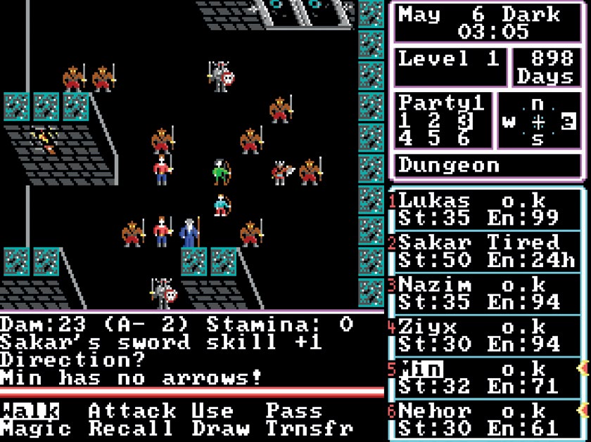 另外一个让我们耳目一新的设计就是队伍的拆分。这个功能允许在某些角色探索地牢的同时,另一个角色在某个城市里赚钱,还有一个角色在其他小镇的酒馆里记忆法术。尽管通常情况下你会想要所有人都一起进入地牢,但探索城市的时候就可以只保留一个人(一般是魅力比较高的那个),其他人都去赚钱、休息、训练、或者记忆法术。这种分头行动在解决游戏中某些问题的时候是很重要的方式。