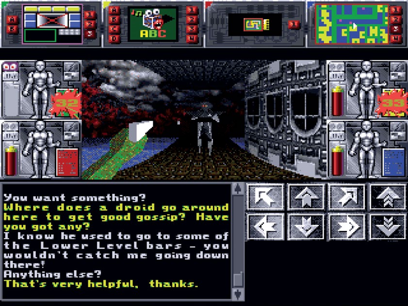 续作《解放》(Liberation: Captive 2, 1994)是真的很有野心。再一次操控你的四个机器人踏上旅程,你必须要调查一桩隐藏在未来风格的敌对城市里的谋杀案。这座城市规模宏大——是个拥有商店、图书馆、办公室、房屋等元素的大型开放世界。游戏使用了全 3D 画面、可定制化界面,还引入了和 NPC 对话的功能,这样就可以用更加和平的方式解决问题。
