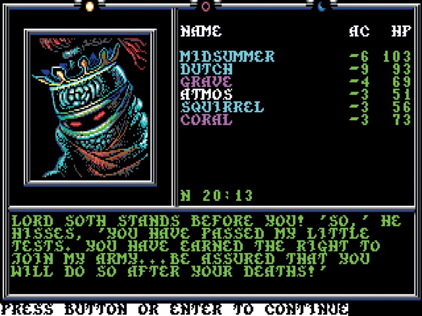 一段时间之后,我卖掉了我的 Commodore 64 换了一台 PC,这样终于可以玩到三部曲剩下的部分了:发售于 1991 年的《克莱恩死灵骑士》(Death Knights of Krynn),和发售于 1992 年的《克莱恩黑暗之后》(Dark Queen of Krynn)。我为了导入角色到续作中而重玩了《克莱恩英豪》(可能是第五遍了)。即使那时候我已经老了十岁,而且本作在当时已经算是最渣的画质,但它依旧是我最喜欢的 RPG。