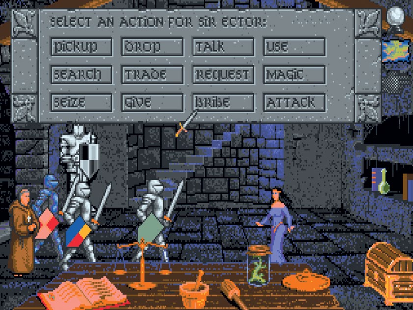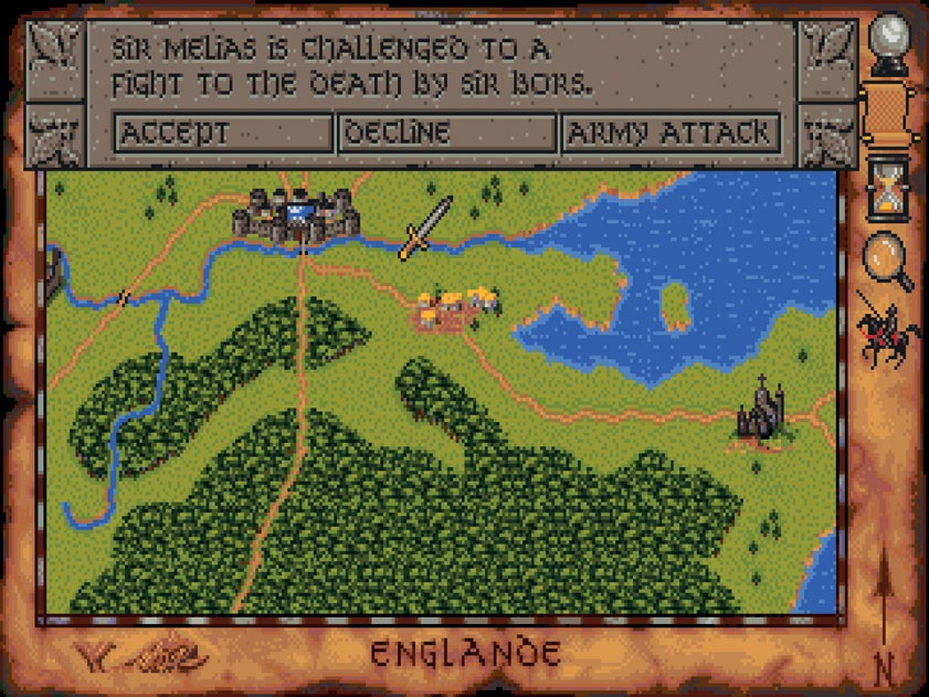 回想当年,游戏开发者经常将多种游戏类型糅合在一起。本作就是如此,几乎包含了所有东西——探索、策略、冒险、以及一些 RPG 元素。你可以在(简单的)策略性战斗中控制军队,指引手下若干骑士小队在战役地图上搜寻线索、任务、和所需道具。过程中你会见到很多形形色色的可互动角色,跟一些人交易,向另一些人打听情报,帮助当地民众,以及忙碌于拉拢盟友和招募新的骑士。