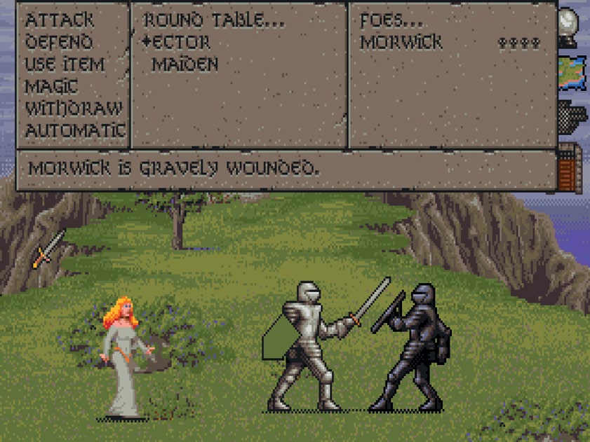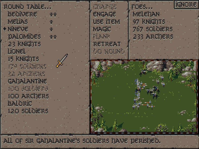 一些骑士之间有旧仇,应该被分开;另外一些的道德品质则令人怀疑,他们可能阵前倒戈;不过大多数时候你只会依赖于那几个关键的骑士、巫师、和僧侣来取得胜利。有些骑士自己会统领一部分军队,你需要指挥他们来反击萨克逊[2]军队和强盗,但大多数骑士你都会以 RPG 的方式雇佣,在战斗中要面对多个敌人,辅以魔法、药水、以及其他有用的道具。