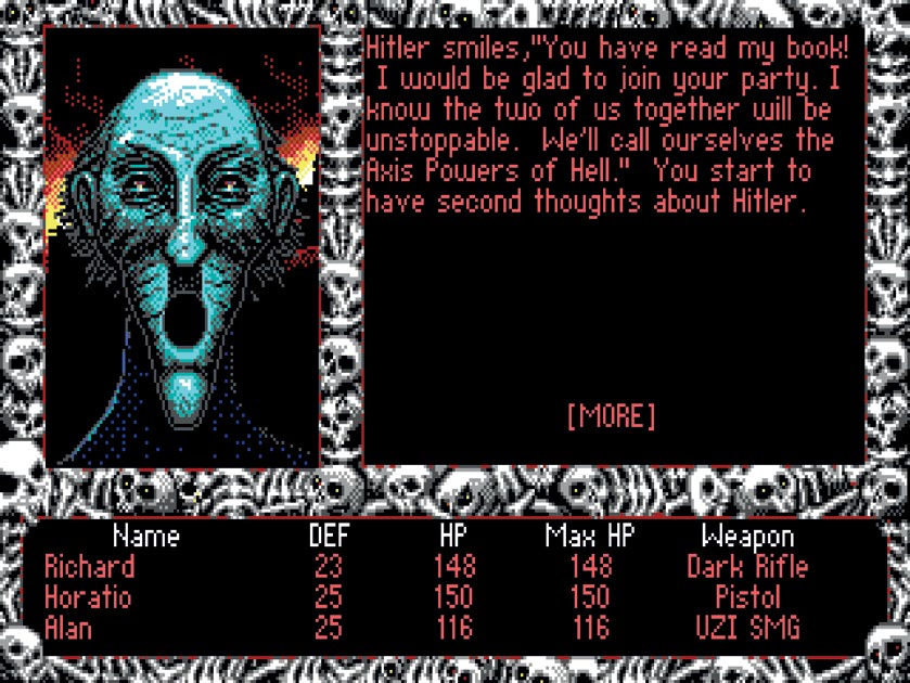 实际上,和历史上流芳百世(或者臭名昭著)的大人物组队探索地狱荒芜的土地就是《逃离地狱》全部内容。这游戏的难度相对较低,所以主要的挑战就在于决定让谁加入或者离开 Richard 的队伍。从机制上来看,《逃离地狱》就是一个简化版的《废土》(Wasteland):一个俯视角回合制 RPG,有属性值、技能(大部分都是战斗用的,但也有不是的)、和使用了动画化敌人肖像的第一人称视角战斗等设定。