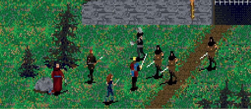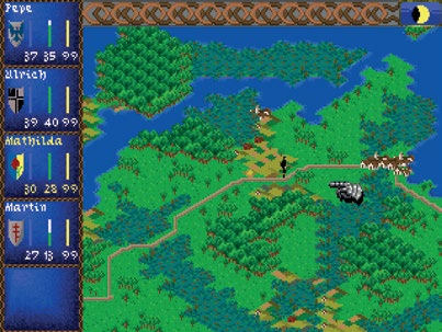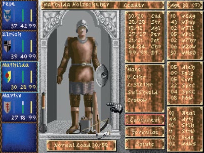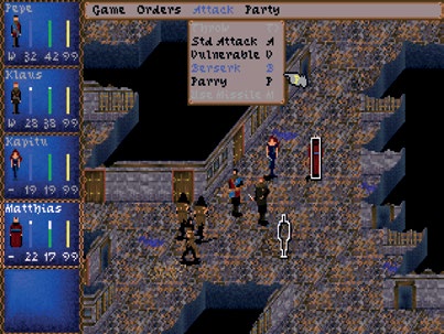 你的探索过程往往会被快节奏的 45 度俯视角战斗打断,由带有暂停的实时战斗[1]方式呈现——在当时,这两个都是非常新奇的概念。通常情况下,在战斗开始前,玩家可以为自己的队伍施加神圣之力,或是投掷炼金药水从而得以逃跑。然而,如果没有合适的装备和配置,这些遭遇战可能会极为难缠,甚至会让你被强盗洗劫得只剩藏在鞋子里的几分钱。