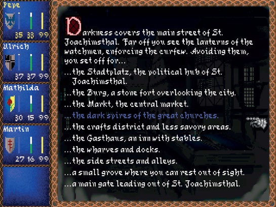 《黑暗纪元》以一纸压抑的警告——“在中世纪德国,现实比幻想恐怖的多”拉开序幕,而游戏也的确还原了这句话:不管恐怖的来源是一个吃小孩儿的撒旦教徒,还是只是要你拖着伤痕累累的身体,用勺子挖出一条越狱的路。虽然发行年代尚早,但《黑暗纪元》独特地将 CYOA 进度系统、庞大的历史背景和无职业区分的角色构筑混合在一起,带来了新鲜而原滋原味的游戏体验。