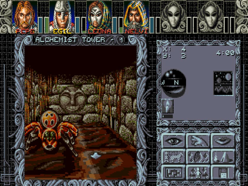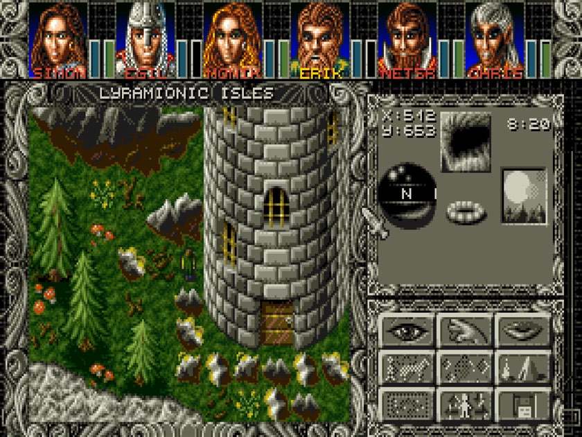 那么,就让我们来看看游戏本身如何吧。《琥珀之月》的故事设定在《琥珀之星》(Amberstar)的几十年后,游戏系统基本与前作保持一致:还是同样的回合制方格图战斗,同样的物品栏和对话系统。续作也原封不动地保留了两种探索视角:建筑和野外采用等距斜 45 度视角,地牢和城镇则是第一人称视角——不过,现在是 3D 的第一人称了。《琥珀之月》的设计和《阿尔比恩》(Albion,1995)较为接近,后者名声更响,由 Thalion Studio 的前员工们开发。