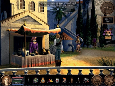 旁白(由 John Rhys-Davies[4] 配音,他在《指环王》中饰演金雳 Gimli)听起来像一位老练的游戏主持人,为玩家描述景象、气味和声音。角色有大量的对话,既有严厉的警告,也有插科打诨。最令人难忘的是三位城镇居民,他们的声音听起来像 Jack Nicholson[5],Rodney Dangerfield[6],以及,呃,Jack Nicholson(这些配音演员被问起他们能模仿哪些名人的声音,结果有两个人回答 Jack Nicholson,于是他们就这么做了)。