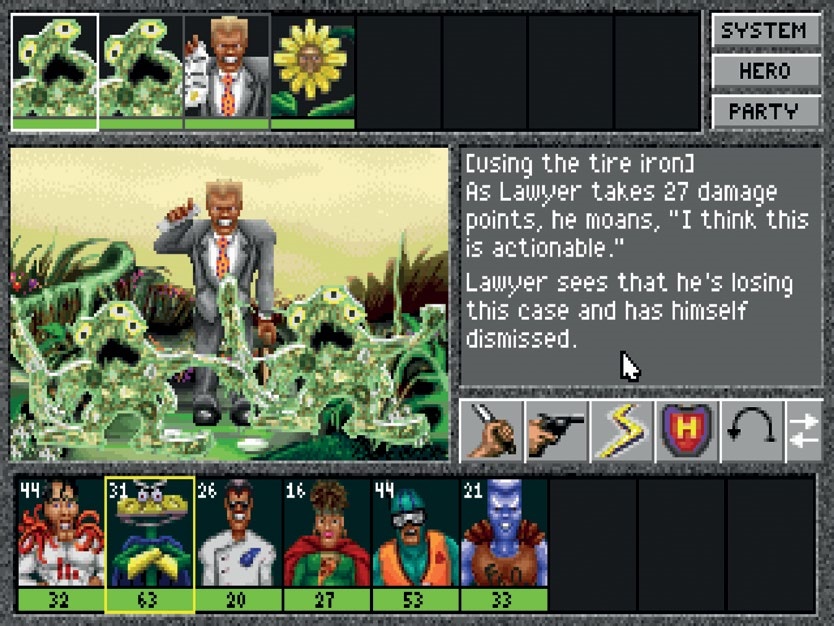 玩家时常还将遭遇神奇怪物并发生战斗,比如灵能传道士(psionic evangelists)、基因突变的官老爷(mutant bureaucrats),还有机器人版本的理查德 · 尼克松(robotic version of Richard Nixon)[3]。战斗是回合制的,非常简单,它允许最多 9 个英雄参与战斗。大多数英雄只会近战或射击,但有一些奇葩技能且强大的技能,如热带石油人(Tropical Oil Man)的“增加敌人的胆固醇”。