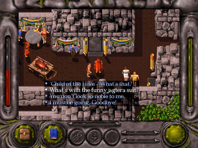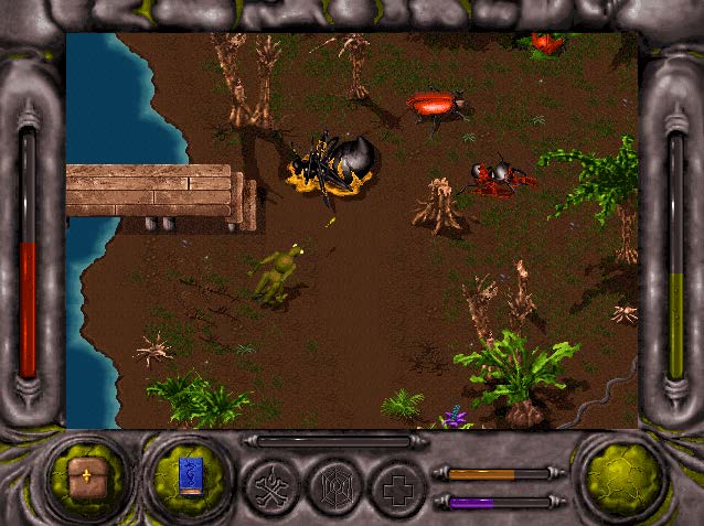 遗憾的是,《食人虫》的乐趣也就到此为止了。游戏使用《阿拉丁传奇》(Al-Qadim)的引擎开发,力图延续 RPG、动作和冒险元素融合的风格,但一个都没做好。游戏从一个充满各式有趣 NPC 和支线任务的村庄展开,但很快故事变得线性而且叙事上给人一种赶工和半成品的感觉。