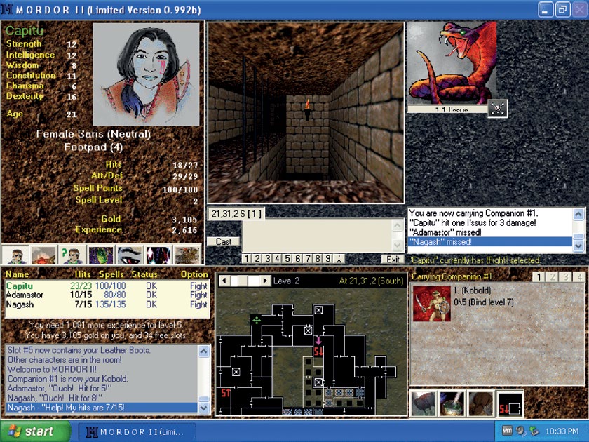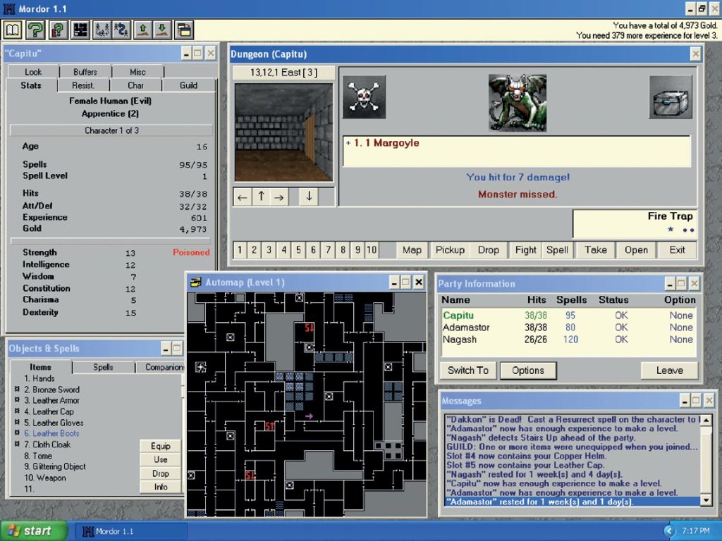 《魔多》只有一个地牢,但它横跨 15 个层,每层大小是 30×30 格。包含反魔法区域和水下区域、传送门、身陷其中会遗失物品的流沙、消除 BUFF 的方块,当然,还有大量布置了陷阱的宝箱[4],这些陷阱会引发各种后果,从转移或毒害队伍成员,到直接杀死他们等等。对你来说这就是一片需要步步为营的场地。