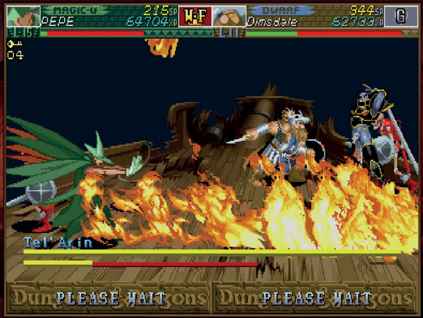 《龙王》有些过分简化,不过 Capcom 在这个类型上做了更多的投入,然后在 1993 年发布了《龙与地下城:毁灭之塔》(Dungeons & Dragons: Tower of Doom)。现在这是一款《龙与地下城》的官方游戏了。《毁灭之塔》允许最多四人同时游玩,玩家可以选择战士、牧师、精灵和矮人与标志性的生物作战,例如枭熊(Owlbear)、移位兽(Displacer Beast)和巫妖(Lich)。