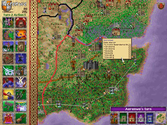 游戏中最庞大且核心的内容就是其战略大地图。你可以从十八个可选的王国中选择一个,领导它面对戈尔贡的入侵并最终取胜。这个系统实际上是十分优秀和复杂的,因为游戏为玩家提供了很多可执行的选项,比如打造防御建筑、施放群体法术、建立贸易路线或是进行间谍活动。玩家可以自由选择游玩的风格。