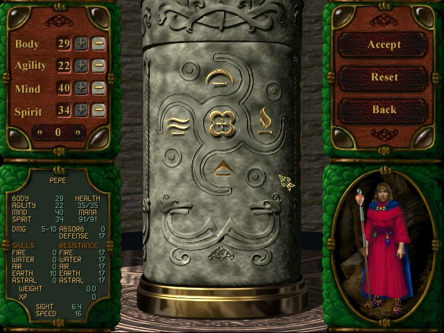 开始游戏的第一步是创建角色,但你仅仅能在魔法师(Wizard)和战士(Warrior)之间二选一,然后决定姓名、性别和主要技能。你也能对 4 个基础数值进行微调,不过它们基本不起多少作用。