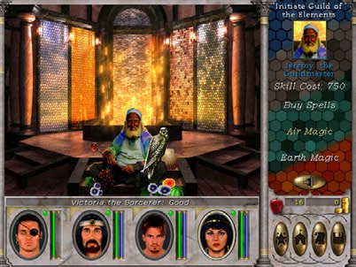你的队伍有四名人类冒险家组成,他们每人都能选择六种职业中的一种。《魔法门 6》使用了一种经典的机制,即导师培训技能的机制,一些专家级别的导师经常隐藏在一些不起眼的地方。角色可以自由掌控他们职业中的任一项技术,也可以在他们可用的法师学校学习一些法术。