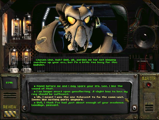 说实话,幽默是《辐射 2》的主要基调之一。虽然《辐射 1》在提供精致的游戏内容和沉浸的游戏体验上下了很大功夫,但是它的续作却打破了很多“墙”——包括次元壁——为使玩家可以在其中尽情享受欢愉。