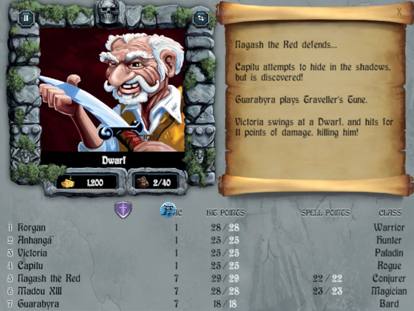 作者 Michael Cranford 的雄心壮志最终以这样的效果呈现:游戏中有一块第一人称视角的窗口,利用伪 3D 效果和材质贴图的变化,营造出一个栩栩如生的虚拟世界,玩家仿佛真的能穿行其中,获得绝佳的沉浸式体验。屏幕下方则列出了玩家的 1-6 号角色,还有一个空位保留给召唤生物或是暂时加入你勇猛小队的 NPC 角色。