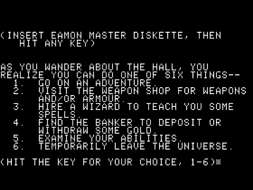 这意味着如果你在新手洞穴最后拿到了一把魔法剑,你可以把它带进一场宇宙大冒险,用它阻止外星人侵略;再把你新得到的爆破来复枪带去古希腊,和米诺陶作战——任何冒险皆有可能,只要你能搞到磁盘。也许你可以在上学或者工作时弄来一盘,或是通过邮件和别人交换,抑或是自己亲手制作一份。要记得,这可是早在网络和 BBS 论坛火遍世界前的那个年代发生的事啊!