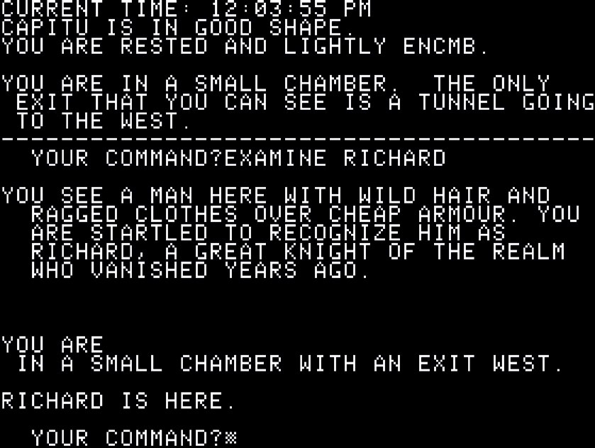 发售于 1979 年的《荒野战役》(Wilderness Campaign)是一款更具野心的 RPG。在其中你可以探索一大片野外区域,和敌人战斗并且在遗迹中搜寻宝藏,然后在村庄中雇佣更多的队伍和购买装备——这一切都是为了跨越整个地图,到达城堡并击败一位邪恶的亡灵巫师。