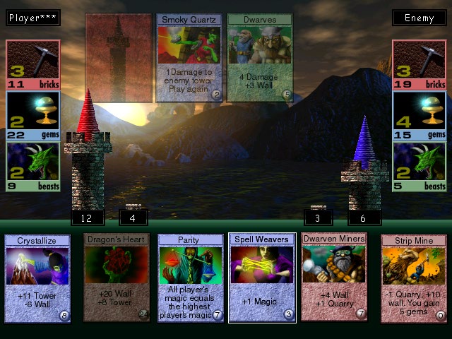 这个游戏还有一个特色,或许也是 RPG 历史上最好的小游戏。在《巫师 3》(Witcher 3)的昆特牌(Gwent)出现之前还有个名叫魔幻牌(Arcomage)的小游戏。魔幻牌毫无疑问是一个更有深度、更平衡的集换式卡牌游戏,时至今日还有线上的多人游戏大厅。