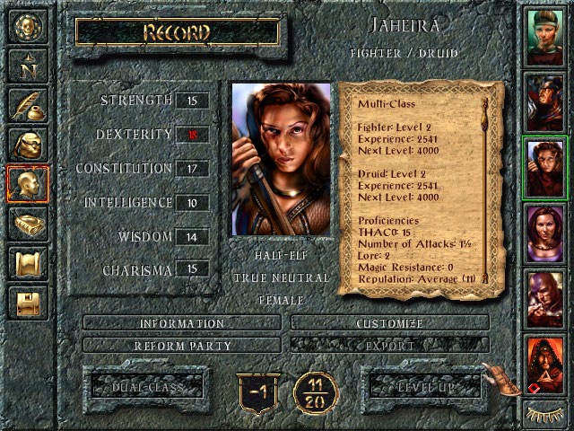 然而在实际的游戏过程中,最开始的角色创建显得无足轻重:无论如何,你都将操作 4 个英雄(分别是男性/女性战士和男性/女性魔法师),因为另外三个角色总会在故事中出现并加入你的队伍。