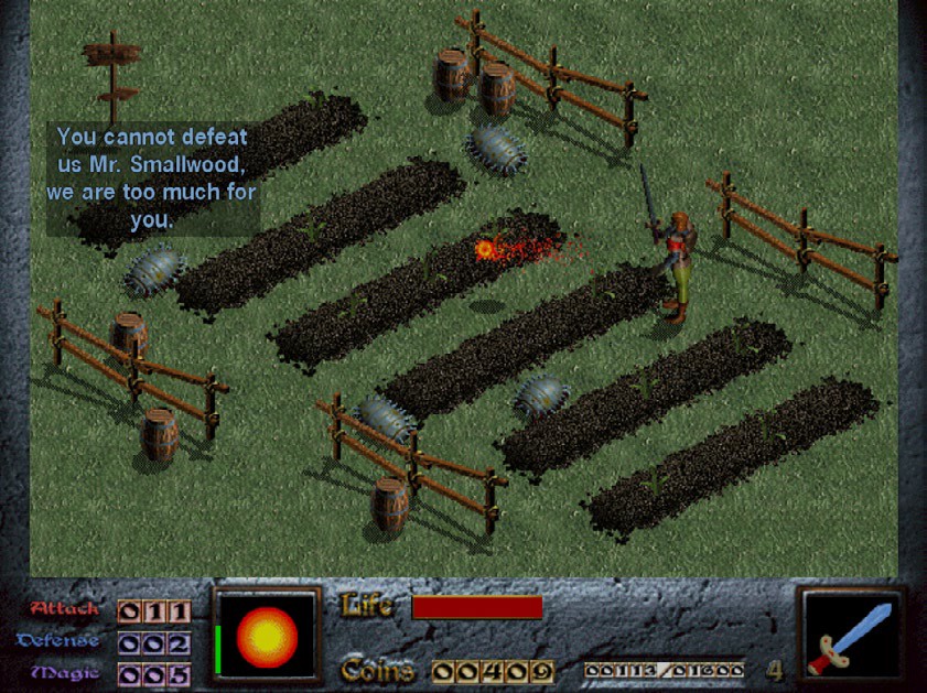 游戏流程很简单:在地图上旅行,和 NPC 对话,和怪物战斗,最终提升你的三个属性——攻击、防御和魔法——以及找到新的武器和咒语。